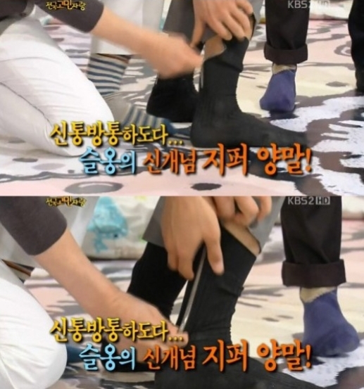 26일 밤 방송된 KBS2 '대국민 토크쇼 안녕하세요'에 출연한 임슬옹은 독특한 지퍼양말을 신고 나왔다.