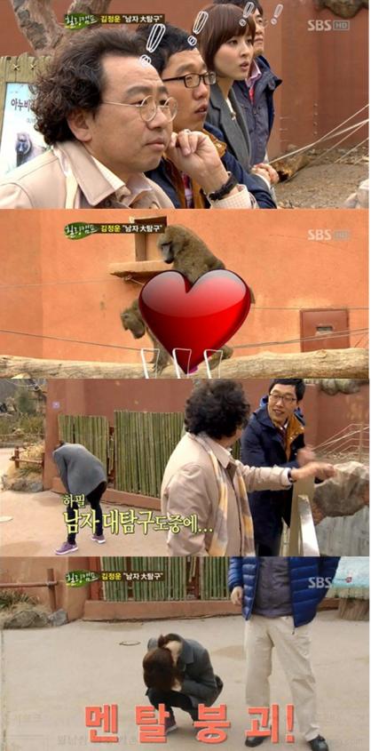 이들이 동물원의 원숭이가 있는 곳에서 이야기를 나누던 도중 원숭이의 돌발행동에 배우 한혜진이 깜짝 놀라 웃음을 주체하지 못하고 바닥에 주저앉았다.