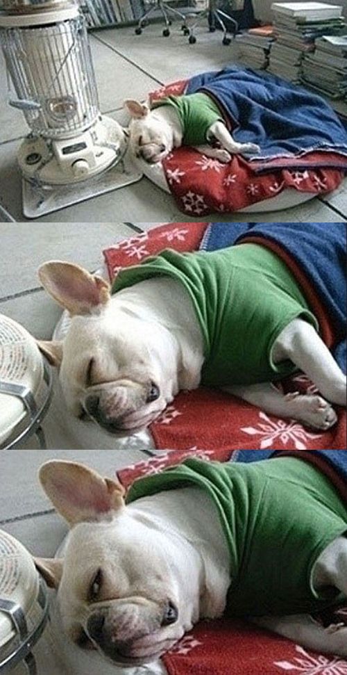 사진에는 강아지가 난로 옆에서 잠이 든 모습이다.