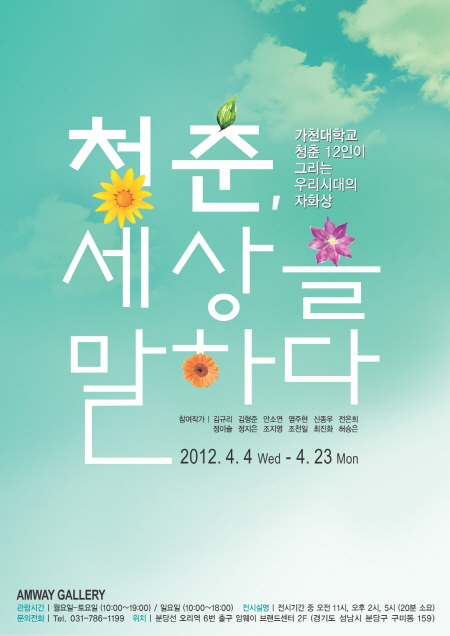 한국암웨이 (대표 박세준)는 경기도 분당 암웨이 갤러리에서 오는 4월 4일부터 23일까지 작가를 꿈꾸는 20대 청년 화가들의 전시회인 ‘청춘, 세상을 말하다’를 개최한다고 28일 밝혔다.