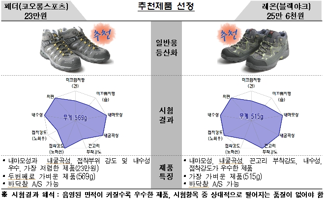 이에 앞서 지난 21일 한국소비자원은 국내 아웃도어 브랜드 등산화 10개 제품(일반용 등산화 5종, 둘레길용 등산화 5종)의 품질을 비교해 코오롱스포츠의 '페더'와 블랙야크의 '레온'을 추천제품으로 스마트컨슈머에 발표했다.