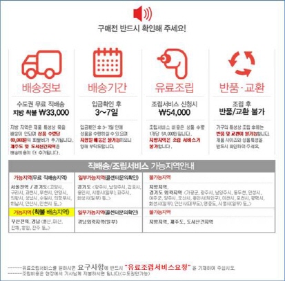 확인 결과, 상품 이미지 우측에는 아이콘 형태로 ‘무료배송’과 ‘무료설치’ 표기가 돼있는 것과는 달리 하단 상품상세정보란에는 '배송비, 설치비 유료'라고 상반된 내용이 기재돼 있었다.