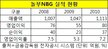29일 관련업계와 놀부놀부NBG에 따르면 지난해 매출액(3월 결산법인)은 전년대비 소폭 증가한 1천300억원으로 추정된다. 2008년 1천7억, 2009년 1천47억, 2010년 1천113억 등 4년 연속 플러스 성장이다.