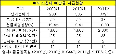 29일 금융감독원에 따르면 에이스침대는 2009년부터 지난해까지 3년간 총 96억원의 배당금을 지급했다. 이 가운데 오너인 안성호 대표가 챙긴 배당금은 무려 83억원에 달한다. 전체 배당금의 86.5%에 해당하는 수준.