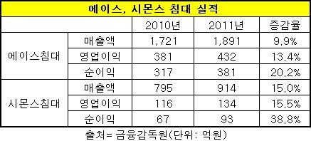 관련업계에 따르면 연간 8천억원 규모인 침대시장에서 에이스침대는 29%, 시몬스침대는 12%의 시장점유율을 기록하고 있다.
