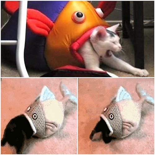 공개된 사진에는 물고기 인형 속으로 고양이가 들어가고 있는 모습이 담겨있다.