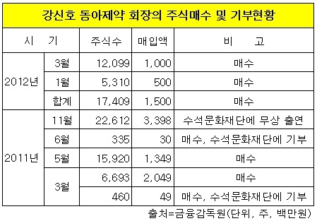 강 회장은 지난해 3월 동아제약 주식 7천153주를 21억원에 매수하고, 이 가운데 460주(5천만원)를 수석문화재단에 기부했다. 나머지 6천700여주(20.5억원)는 그해 5월 강 회장이 장내매수한 자사주 1만6천주(13.5억원)와 합쳐 재단에 무상출연됐다.