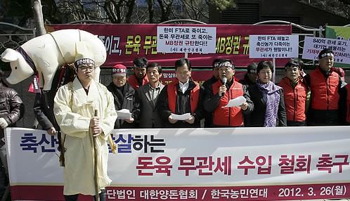 돼지고기 공급 중단 선언을 한 양돈협회는 "올 2~3월 돼지 값은 정부가 정한 가격상한선보다 20% 이하를 밑도는 등 생산비 이하로 폭락한 상태"라며 "한·미 FTA 발효로 냉동삼겹살의 관세율이 25%에서 16%로 낮아져 미국산 삼겹살의 대량수입이 예고된 상황에서 무관세 추가 수입은 양돈 농가를 말살하겠다는 정책"이라고 비판의 목소리를 높였다.