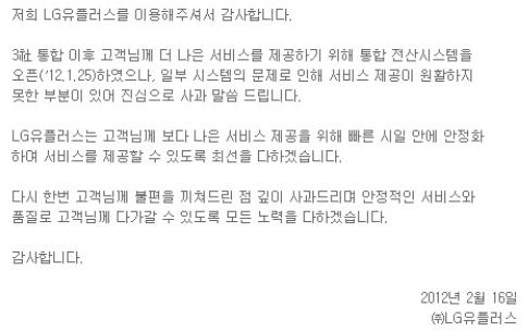 ▲LG유플러스 공식 홈페이지를 통해 게시된 사과문.