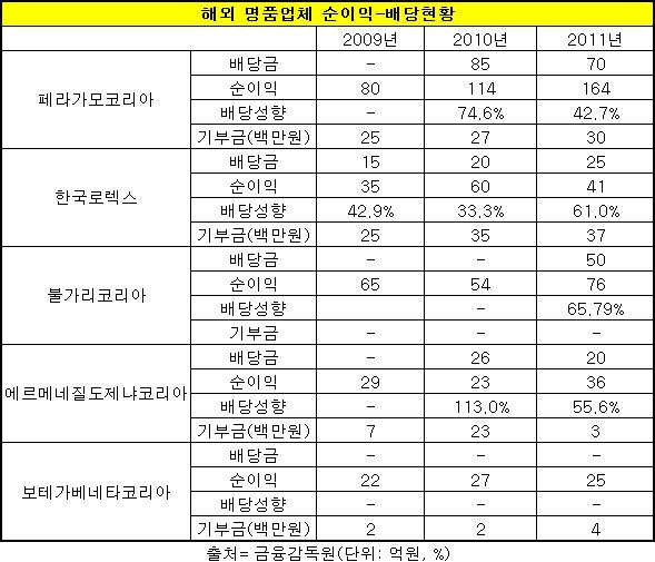 불가리, 페라가모 등 세계적인 명품업체들의 ‘쥐꼬리 기부’와 ‘거액 배당’이 올해도 재현돼 비난의 목소리가 커지고 있다.