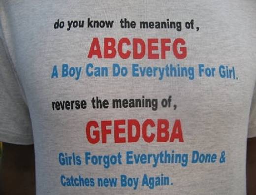 반면, GFEDCBA의 뜻은 'Girls Forgot Everything Done &Catches new Boy Again'의 약자로 여자들은 남자가 해준 그 모든 것을 잊고 새로운 남자를 만난다는 의미다.
