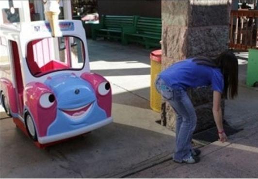 공개된 게시물 사진에는 한 여자가 허리를 숙이고 있고 눈이달린 귀여운 자동차 한 대가 마치 여성의 엉덩이를 보고 있는 듯 하다.