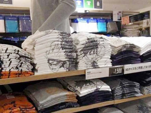 해당 사진 속에는 일본 인기 애니메이션 '나루토'의 캐릭터가 그려진 티셔츠 진열 모습이 담겨 있다.