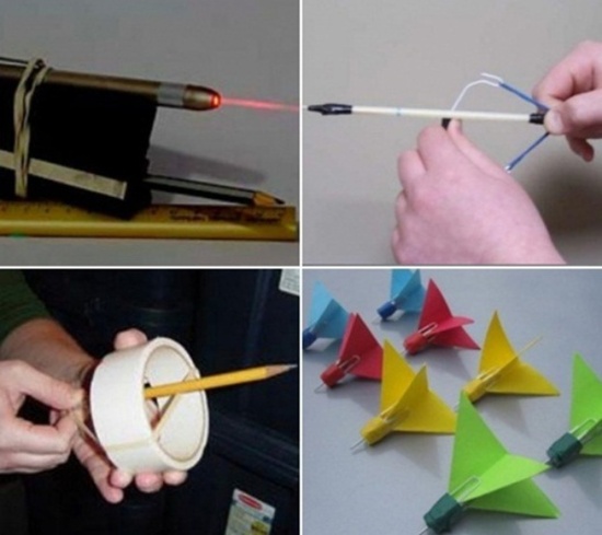 또 테이프 몸채에 끈을 연결해 연필이 화살이 된 경우도 있는가 하면 형형색색의 색종이를 접어 가운데에 압정을 고정시켜 무기를 만들기도 했다.