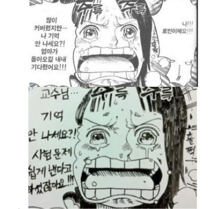 사진은 말 그대로 시험이 끝나고 강의실 칠판에 그려진 낙서를 촬영한 것으로 입을 크게 벌리고 눈물과 콧물을 주룩주룩 흘리고 있는 일본 만화 '원피스' 캐릭터의 모습이 그려져 있다.