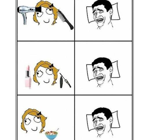 먼저 여자는 6시30분에 맞춰놓은 알람소리에 맞춰 정확하게 기상한 뒤 샤워를 하고, 머리를 말리고, 화장을 한 뒤, 아침식사까지 해결하는 반면 남자는 이 모든 과정을 생략하고 잠자리에서 일어나 곧장 가방을 메고 집을 나서 보는 이들로 하여금 폭소케 하고 있다.