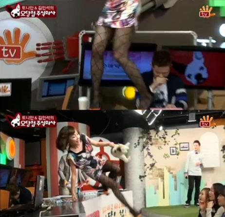 3월 30일 첫 방송 된 손바닥 TV ‘토니안 김인석의 오당첨주식회사’에서 출연자인 힙합듀오 긱수가 노래와 춤을 선보이자 기쁨을 참지 못한 낸시랭은 테이블 위로 올라가는 돌발행동을 보인 것.