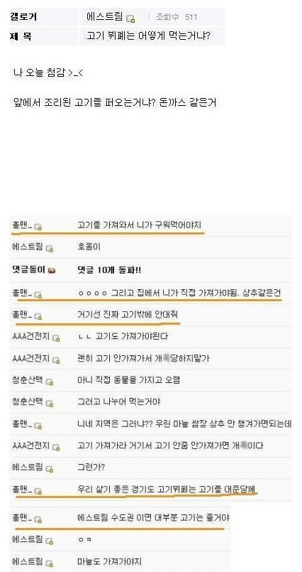 사진 속에는 "고기뷔페는 어떻게 먹는 거냐"는 질문 글과 이에 대한 네티즌들의 장난스러운 답변이 담겨있다.