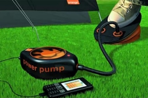 가장 먼저 소개한 펌프식 충전기는 발로 펌프를 밟으면 휴대전화가 충전되는 방식이다.