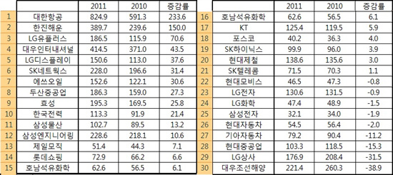 작년 30대(매출액 기준) 기업 가운데 대한항공과 한진해운의 빚이 가장 늘어 부채비율이 눈에 띄게 높아진 것으로 나타났다.