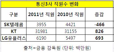 SK텔레콤은 SK플래닛 분사로 인해 2010년 4천421명에서 지난해 3천955명으로 줄었다. KT는 2010년 3만1천155명에서 지난해 3만1천981명으로 826명 늘었다. LG유플러스는 전년보다 693명 늘어난 5천497명이 근무하고 있다.