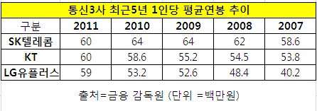 지난 2009년까지만 해도 통신3사중 SK텔레콤의 연봉이 KT나 LG유플러스보다 850만(KT대비)에서 1천140만원(LG유플러스 대비)까지 높기도 했으나 2010년 동결에 이어 작년 400만원 감소로 인해 3사의 연봉 격차는 이제 거의 사라져 버렸다.