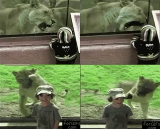 이어 또 다른 영상에서는 한 아이가 유리를 사이에 두고 아기 사자를 배경으로 사진을 찍고 있다.