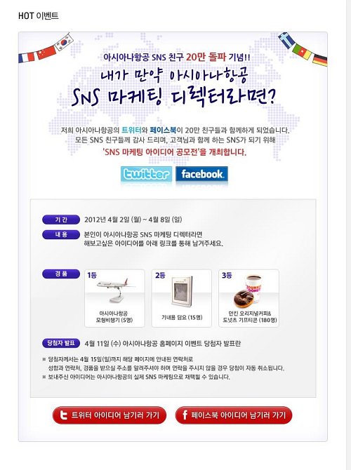 한편 아시아나는 SNS 친구 20만명 돌파를 기념해 오는 8일까지 'SNS 마케팅 아이디어 공모전'을 개최한다. 아이디어를 남긴 고객들 중 추첨을 통해 200명에게 아시아나 모형항공기, 기내 담요 등을 선물한다.