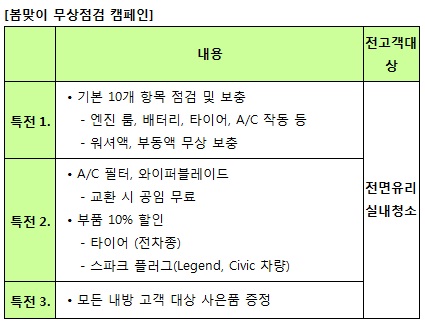 또 겨울 동안 사용하지 않은 A/C 의 점검과 함께 필터 또는 와이퍼블레이드 교체 시 공임비 전액을 지원한다. 전 차종의 타이어와 레전드, 시빅 차량의 스파크 플러그는 10% 할인된 가격에 제공한다.