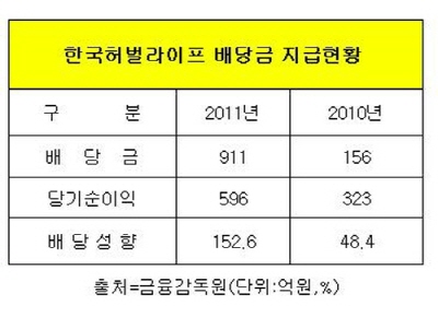 4일 금융감독원 보고서에 따르면 한국허벌라이프가 지난해 지급한 배당금은 911억원으로 전년보다 6배 가까이 늘어났다. 한국허벌라이프는 미국 본사가 100% 지분을 보유하고 있기 때문에 거액의 배당금은 모두 본국으로 송금됐다.
