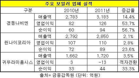 반면 귀뚜라미홈시스는 영업이익이 적자전환해 3개 업체 가운데 실적이 가장 쪼그라들었다. 영업이익은 2010년 3억원에서 지난해 13억원 적자 전환했다. 매출액은 전년 대비 3.5% 증가한 1천720억원, 순이익은 33.3% 늘어난 44억원을 기록했다.