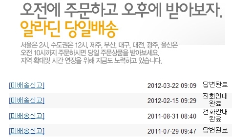 이에 대해 알라딘 관계자는 “올해 3월의 경우 신학기가 있다 보니 물량이 2배 이상 많아지면서 당일배송에 차질이 생기는 경우가 발생했다”며 “출고는 당일 날 하지만 물량이 많다보면 택배기사 배송에서 밀리는 경우가 있지만 당일 배송 성공률은 90% 이상”이라고 말했다.