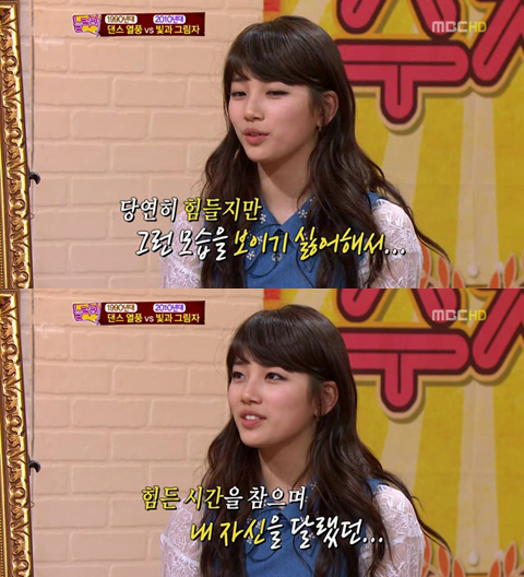 이날 방송에서 수지는 슬럼프에 대한 이야기를 나누는 중 "데뷔 이후 한 번도 쉰 적이 없다"며 "당연히 힘들지만 티를 내는 걸 싫어한다. 누구한테 말하는 것도 싫어한다"고 고백을 했다.