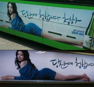 사진에서 신세경은 실제 사진보다 훨씬 긴 다리의 사진이 버스광고에 실린 것을 볼 수 있다.