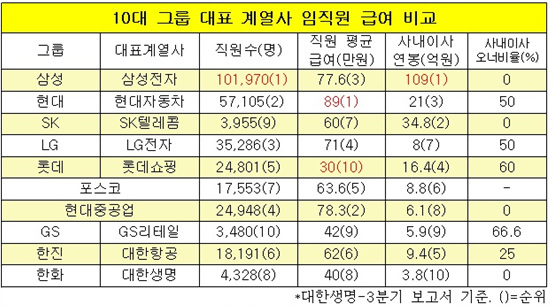 직원수는 삼성전자가 10만1천970명으로 가장 많았다. 현대차가 5만7천105명, LG전자가 3만5천286명으로 각각 2위와 3위에 올랐다.
