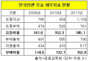 주요 재무지표인 유동비율이 2009년 161.6%, 2010년 152.3%, 2011년 145.1%로 줄어드는 추세다. 유동비율은 업종이나 기업의 특성에따라 다소 차이는 있지만 100%이하를 안정 수준으로 평가한다. 부채비율 역시 2009년 114.6%, 2010년 132.7%, 2011년 152.8%로 악화되고 있다.