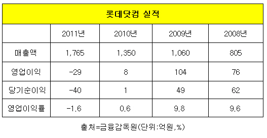 5일 금융감독원에 따르면 롯데닷컴은 지난해 29억원의 영업손실과 40억원의 당기순손실을 기록하며 적자전환했다. 같은 기간 매출액은 1천765억원으로 전년동기대비 30% 증가해 외형성장 면에서는 나무랄데 없었다.