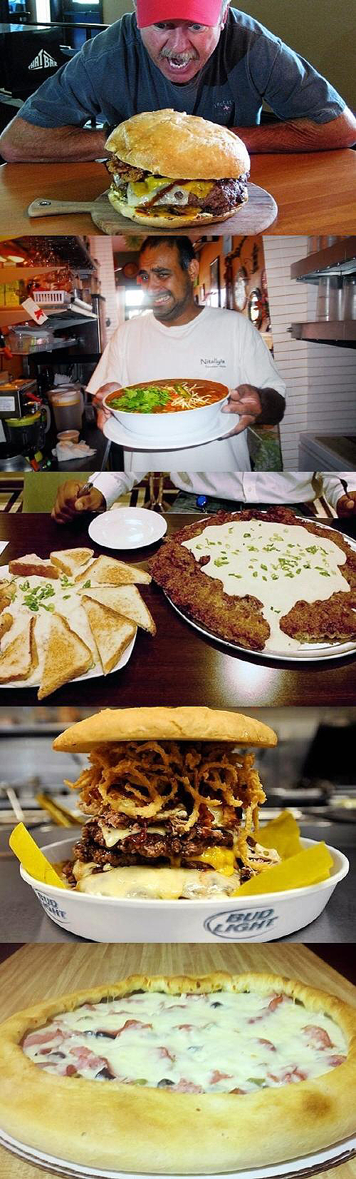 댓바의 '댓 버거'는 지름 30cm의 버거와 1/4파운드 프라이, 어니언 링을 1시간 내에 먹어야 하는데 40명의 도전자가 있었지만 모두 실패했으며, 스타디움 그릴의 '더 헤일 메리, 오 주여'는 20㎝ 높이에 2.3㎏의 햄버거와 0.5㎏에 달하는 프라이드를 1시간 내에 먹는 미션이지만 150여 명의 도전자 모두가 실패했다.