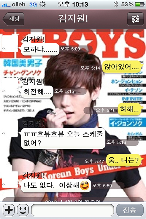 공개된 문자 내용은 김지원이 먼저“뭐하냐”고 묻자 이종석은“앉아있어”라고 말한다. 이어 김지원은 “허전해”라고 말하고 이종석도 “허해”라며 ‘하이킥3’의 종영 후 허전한 심경을 드러냈다.