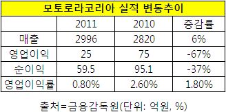 6일 금융감독원에 따르면 모토로라코리아의 지난해 영업이익과 순이익은 각각 25억원과 59억원으로 전년대비 67%, 37% 급감했다.