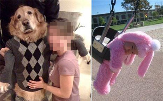 공개된 사진에는 니트를 입은 개가 두발로 서서 다소 힘들어하는 표정과 대조적으로 주인은 개의 배를 만지며 행복한 미소를 짓고 있다.