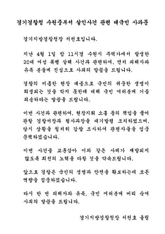 경기도 수원에서 발생한 토막사건의 경찰 늦장 대응으로 논란이 일자 경찰이 대국민 사과문은 발표했다.