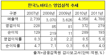 9일 금융감독원에 제출된 한국노바티스의 2011년도 감사보고서에 따르면 이 회사는 지난해 매출액 4천800억원, 영업이익 279억원, 당기순이익 193억원을 기록했다. 전년대비 매출액이 9.9% 늘어난 것. 지난해 영업이익률은 5.8%, 순이익률은 4%로 집계됐다.