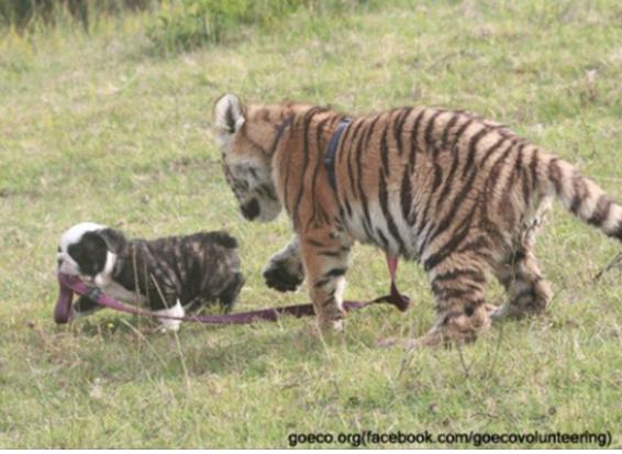 호랑이를 산책시키는 강아지 사진이 화제다.