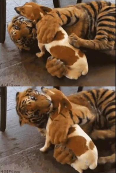 게재된 동영상 속에는 호랑이와 강아지가 서로 뒤엉켜 있는 장난을 치고 있는 모습이 담겨 있다.