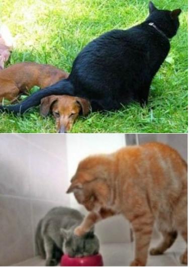 한 거대한 고양이가 꼬리로 강아지의 머리를 꽉 누른 채 올라타 있다.
