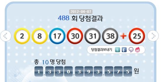 5일 추첨된 제488회 나눔로또 1등 당첨번호는 '2, 8, 17, 30, 31, 38'이 선정됐다. 2등 보너스 번호는 '43'이다.