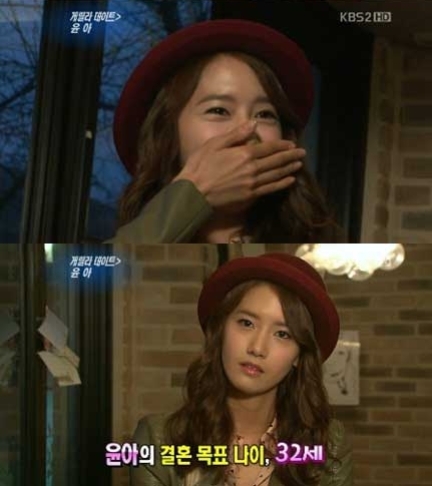지난 7일 오후 방송된 KBS 2TV '연예가 중계'에 드라마 '사랑비'의 여주인공으로 게릴라데이트에 나선 윤아는 "결혼은 언제 하고 싶냐"는 리포터의 질문에 잠시 고민하더니 "32살쯤 하고 싶다"고 답했다.