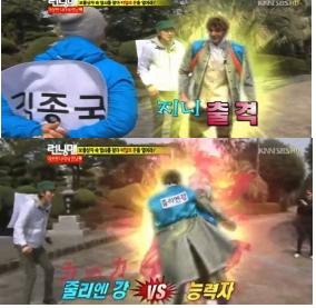 이후 줄리엔강과 김종국이 마주한 자리에서 줄리엔 강은 김종국을 무력으로 제압한 뒤 이름표를 뜯어내 이광수에게 힌트를 선사해 놀라움을 자아냈다.(줄리엔강 김종국 제압 사진-SBS 방송 캡처)