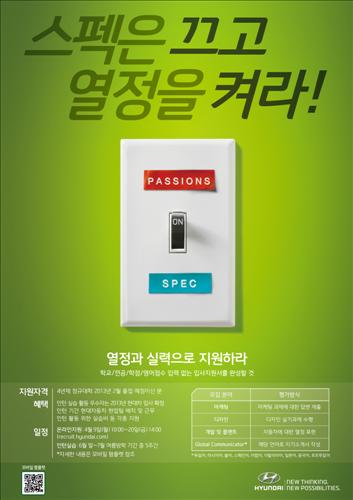 현대차 관계자는 "개인의 창의적 역량을 통해 차별화된 가치를 보여줄 수 있는 마케팅, 디자인, 개발 및 플랜트, 외국어 분야에서 다양한 인재들을 선발하고자 한다"면서 "이를 위해 과감히 스펙을 배제한 열린 선발을 진행하고 인턴 실습 기간의 검증을 통해 신입사원 채용을 결정할 것"이라고 설명했다.